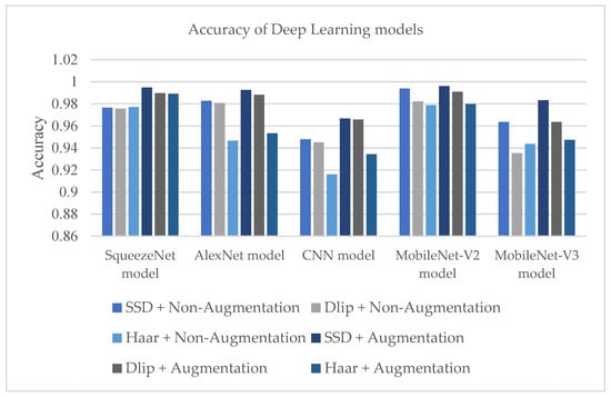The detection of face techniques process resizing all the images, followed by reading and resizing images of the Eyes dataset. The two datasets are then combined. The second step reshapes images so they are appropriate as inputs to deep learning models. The third step uses the LabelBinarizer method to transform multi-class labels into binary labels, which redefines the category label in datasets to binary. In the fourth step, the dataset is randomly split into 70% and 30% for training and testing, respectively, to insure the diversity of images. In addition, the seed for the random generator is set at 40 to ensure the results can be reproduced. Finally, the augmentation method is used for the training dataset by rescaling the images and adjusting the zoom range to 20 degrees. Similarly, the rotation range for images is equal to 30 degrees, as well as providing a True value for the horizontal flip. This is followed by providing a True value for shuffling the data. In addition, the batch size, which refers to the number of training examples utilized in one iteration, is equal to 32. Furthermore, the testing dataset uses MinMaxScalar class for scaling images.
