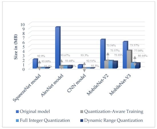 This phase aims to optimize the saved deep learning models by reducing the size of models, after which they are converted to Tensor Flow Lite (TFLite) format. Firstly, the saved models are optimized by using several quantization methods, namely, dynamic range quantization (DRQ), full integer quantization (FIQ), and quantization-ware training (QAT), as described in the next section. Quantization aims to convert the weights of models or activation or both from 32-bit floating-point numbers to 8-bit integer format, which provides a significant reduction in model size, thus leading to a decrease in the device’s memory footprint in devices. Secondly, the deep learning models are converted to TFLite format (.tflite) to enable inference of these models.