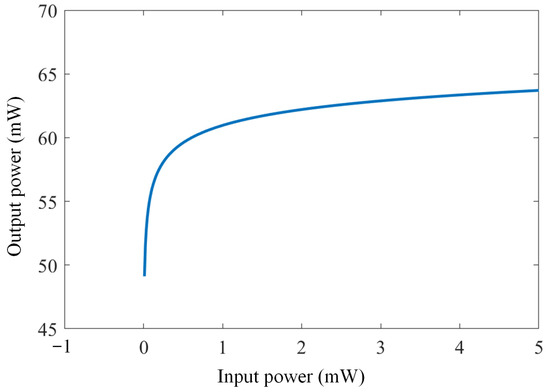 The RC is one of the ANNs in which the activation function is the key element for signal processing. The SOA used in the proposed scheme could perform this activation function through the nonlinear power response. We calculated the power characteristic by using the gain formulas provided in Equations (2) and (3), and plotted the input–output power response, as shown in Figure 2. In the simulation, the length, width, and height of the SOA’s active region were 5.0 × 10−4 m, 3.0 × 10−6 m, 8.0 × 10−8 m, respectively, and the SOA’s bias current was 0.2 A. The dramatic increase in output power was observed in the low-input power region due to the small signal gain from the SOA. The output power plateau was achieved when further increasing the input because of the gain saturation that occurred. Such a nonlinear input–output power response is an ideal activation function in the RC process, enabling signal compensation to be performed in the proposed SOA-RC scheme.