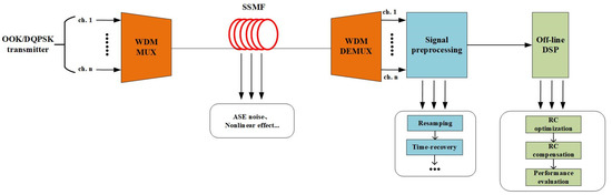 To verify the channel equalization ability of the proposed SOA-RC scheme, we set up a DWDM transmission platform to collect the distorted signals in the system. The simulation platform is depicted in Figure 4. We considered two transmission scenarios, i.e., NRZ and DQPSK, in the system. Through the investigations of both two-typed signals, we could quantify the equalization capability for different systems, such as long-haul or metro networks. The DWDM transmission system was built through VPI simulation software by using standard devices, e.g., standard single-mode fibers (SSMFs), DWDM transmitters, and receivers. To focus on the nonlinear compensation, only Kerr effects were considered in SSMFs. In this DWDM channel, an optical power level of less than 10 dBm would be utilized. Therefore, the FWM effect was the major source of the nonlinear distortion. The proposed SOA-RC was placed at the optical receiver side to perform the mitigation on the impacts from the fiber nonlinearity.