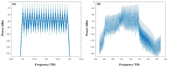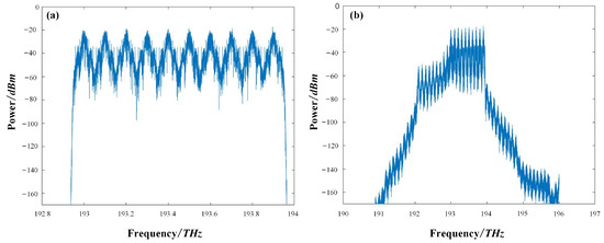 For the NRZ transmission, the 20-channel signals were generated from the OOK transmitter. The data rate for each channel was 10 Gb/s. A loop-based system, including 80 km of SSMF and an erbium-doped fiber amplifier (EDFA), was considered. Only the Kerr nonlinearity and the ASE noise were taken into account in the loop. After the total 800 km of transmission, the DWDM-NRZ signals were split by a wavelength demultiplexer and then coupled into the signal preprocessing unit. Multiple functions, such as resampling and time recovery, were performed in the unit for further off-line digital signal processing (DSP). The preprocessing unit used in the simulation system only performed basic functions to extract valid data from the transmission. It is the routine procedure before the equalizer, without any compensation functions. The DSP module was the proposed SOA-RC, which could compensate for the distortion originating from the SSMF, mainly, in our case, the four-wave mixing between DWDM channels. The key simulation parameters for DWDM-NRZ signals are given in Table 1. In Figure 5, we plot the input and output spectra of the 20-channel DWDM-NRZ signals in the system. The clear FWM products are shown in Figure 5b, confirming that the nonlinear FWM process occurred in the transmission system.
