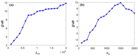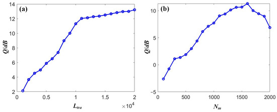 The dependence of the signal quality Q on (a) the training length Ltra and (b) the input mask dimension Nm for DQPSK signals.