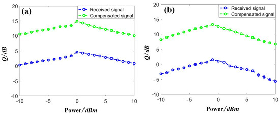 Distorted and compensated DQPSK signals with launched optical powers in (a) Channel 1 and (b) Channel 5.