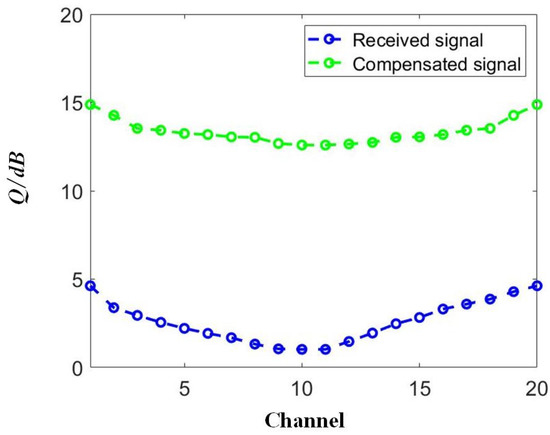 According to Figure 8, the optimized launched optical power was approximately 0 dBm for the NRZ transmission scenario. We measured the results before and after the compensation for all 20 channels, as shown in Figure 9. The signal quality improvement was achieved for each tested channel, confirming the compensation capability for DWDM systems provided by the proposed SOA-RC scheme. After the compensation, the worst Q-factor of the output signals was 12.95 dB and the best was 15.02 dB, enabling error-free transmission after the forward error correction (FEC) operation.
