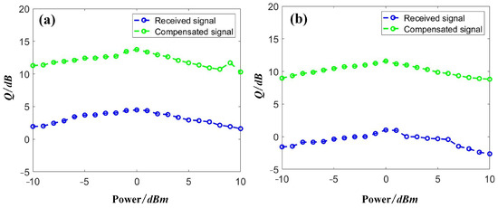 Distorted and compensated NRZ signals with launched optical powers in (a) Channel 1 and (b) Channel 10.