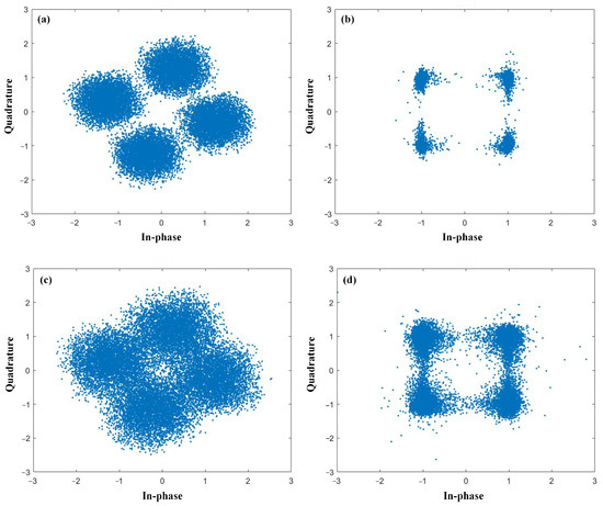 Constellation diagrams for (a) Channel 1 before compensation, (b) Channel 1 after compensation, (c) Channel 5 before compensation, and (d) Channel 5 after compensation.