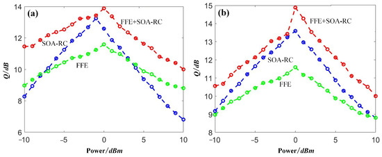 To provide a comparison between the proposed SOA-RC and the classical method, we added the compensation results by using the FFE scheme. The results are depicted in Figure 14. For OOK signals, the improvement was achieved around the optimized launch power of 0 dBm. The maximal Q-gain was over 2 dB, obtained by the proposed SOA-RC. For the case of DQPSK, a clear improvement from SOA-RC was observed at each power point, and the maximal Q gain was up to 2 dB. Therefore, compared with conventional FFE compensation, the proposed SOA-RC provides better performance in the nonlinear propagating channels. In the same figure, we also plotted the results when both SOA-RC and FFE were applied, suggesting the combined operation capability of the proposed scheme.