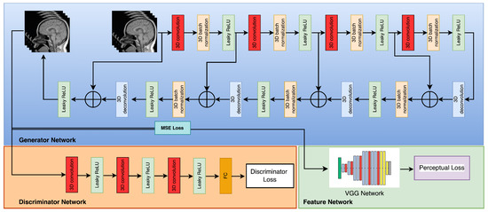 The generator denoted by is associated with a composite loss function that is weighted and encompasses the Mean Squared Error (MSE) loss, VGG loss, and discriminator loss. Figure 7 illustrates the schematic representation of the discriminator network, which is referred to as . The model proposed in this study comprises three convolutional layers, with each layer utilizing filters of different magnitudes, specifically 32, 64, and 128. The configuration of the convolution layers has utilized a uniform kernel size of 3 × 3 × 3. The highest tier is composed of a completely interconnected layer that exclusively generates a singular result. The VGG-19 network, which has been pre-trained, is utilized for the purpose of feature extraction. For further elucidation, those who express interest may refer to the primary source material as recorded in reference [55]. Pan and Yang (2019) have shown that the utilization of transfer learning eliminates the need for retraining the neural network for the targeted MRI images [56]. The aforementioned discovery implies that transfer learning may constitute a viable strategy for enhancing the efficacy of neural networks in the context of medical imaging implementations.