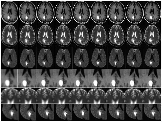 This study assessed the efficacy of diverse super-resolution image reconstruction techniques for Magnetic Resonance Imaging (MRI) T1, T2, and Diffusion Weighted Imaging (DWI) images, using clinical illustrations. The findings of this assessment indicated the existence of a hyperintense hematoma located in the right parietal lobe. The methodology utilized in the investigation comprises of LR input, B-spline Cubic interpolation, Non-rigid multi-modal medical image registration by combining L-BFGS-B with cat swarm optimization (Yang’s N-R-M-3D) [57], Enhanced Deep Residual Networks for Single Image Super-Resolution (Lim’s E-D-R-N-S-I-S-R [58]), image super-resolution using very deep residual channel attention networks (Zhang’s R-D-N-I-S-R [59]), Residual dense network for image super-resolution (RCAN SRR [60]), MRI Super-Resolution using GAN and DWT [43], Brain MRI SRR using 3DGAN [44] and the algorithm suggested by the author. The techniques were organized in a horizontal sequence from the leftmost to the rightmost position. The aforementioned techniques are supported by references [4,61], and [58], as cited in the study. Zoomed-in views are shown in the last three rows.