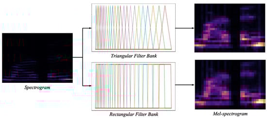 The speech signal had a sampling frequency of 8 kHz, using 4224 data points for 0.528 s. Each frame for the STFT calculations consisted of 256 data points. Because 50% of the overlapping frames were used, a 256-point FFT was performed each time 128 data points were inputted. Mel filtering proceeds by mapping the mel-filter bank, which contains the characteristics of the human auditory structure that are sensitive to low frequencies and insensitive to high frequencies. The mel-filter bank has a huge memory requirement during hardware operations because of the information on the coefficients of all filters. In this study, the positive values of the triangular filter were replaced with 1 and mapped to a rectangular filter, while the complex look-up table (LUT) and multiply–accumulate operations were replaced with simple cumulative sum operations. As seen in Figure 4, the results of the two filters are difficult to distinguish, and no performance degradation occurred during actual training. Different colors in the filterbank in figure are used solely for visual distinction among the filters.