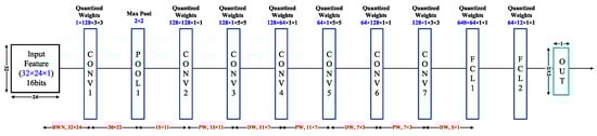 The final network structure proposed in this study, the DS-BTNN, is a combination of DS-CNN and BTNN. Its structure is shown in Figure 5. The entire network consists of nine layers (CL + (DW CL + PW CL) × 3 + FCL × 2), all of which enable BN and sign activation, except for the output layer. Max pooling was performed in the first layer.