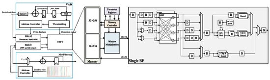 The STFT process is performed using the fixed-point radix-4 algorithm of the decimation-in-frequency method for every 256-point FFT computation. It takes serialized data as input, performs radix-4 operations using a buffer, and stores the partial product of the FFT in a 32 × 128 local memory. As the input data are in the real-number format, the FFT derives 129 non-overlapping complex numbers. Approximation techniques are used to replace complex calculations such as multiplication and squaring that are required to calculate the absolute value in mel filtering with simpler operations, such as bit shift and addition []. The equation is expressed as (2).