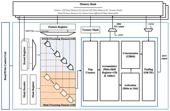 The NNU significantly reduces memory usage by binarizing the network input and ternarizing the weights according to the target. Convolution operations are replaced with XNOR and popcount operations, which significantly reduce the number of computations. It supports variable kernel sizes (1 × 1, 3 × 3, and 5 × 5), variable input/output channel sizes, and various operation modes, allowing not only standard CNNs but also depthwise convolution, pointwise convolution, and fully connected operations to be performed. In addition, each layer can freely set the quantization levels, padding, pooling, bias, and BN options.