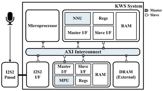 The proposed KWS system is implemented on an FPGA platform with an advanced extensible interface (AXI) bus interface for verification. As shown in Figure 8, the FPGA platform consists of a KWS system that performs voice signal classification. This system includes two processors, each with an I2S2 interface, a microprocessor, a DDR memory, an NNU, and an MPU. Pmod I2S2 includes an analog-to-digital converter that converts the serial voice signal input from the microphone into 16-bit data and sends data bundles of a certain size to the MPU through the I2S2 interface. Each processor contains a DDR memory, an I2S2 interface, a master interface for communication with the processor, a slave interface for communication with the microprocessor, and on-chip memory for storing input/output data. The on-chip memory utilized in this study was BlockRAM with dual port as a hardware component. In addition, both processors have registers for the mode settings, including the quantization levels and BN. This system efficiently transfers data using a 64-bit AXI bus interface for high-bandwidth and real-time communication between the processor and other components.