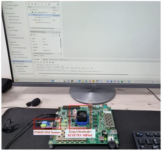 The proposed KWS system was designed using the Verilog hardware description language at the register transfer level, and implemented and verified on the Xilinx UltraScale+ ZCU104 FPGA platform using the Vivado tool. The output results on each platform were compared and verified using the vectors in the Python-based simulator. Table 3 summarizes the resource consumption of the proposed KWS system. The proposed KWS system was synthesized using 27,315 configurable logic block (CLB) LUTs, 25,534 CLB registers, and 31 digital signal processors (DSPs). These values correspond to 11.7% of the total LUTs, 5.42% of the total registers, and 0.87% of the total DSPs on Ultrascale+ MPSOC with XCZU7EV-2FFVC1156. The synthesis results confirm that the system could operate at up to 170 MHz. Figure 9 shows the verification environment on the FPGA platform. The sensor connected to the Pmod terminal of the ZCU104 FPGA board shown in the figure is Pmod I2S2, which has analog-to-digital converter and digital-to-analog converter circuits connected to each of the two audio jacks. These circuits help to transmit and receive data via the I2S protocol, and in this design, a microphone was connected to the input terminal to receive real-time voice signals.