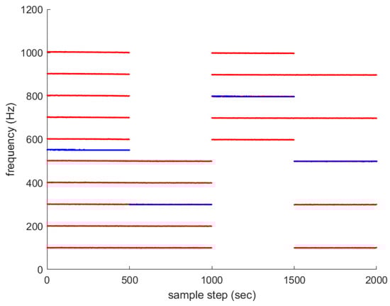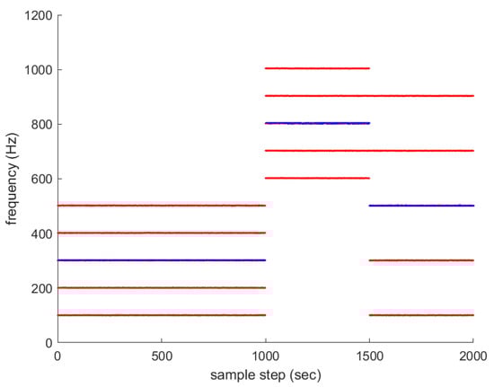 In the case where the gating conditions are not satisfied at sample-step k, one can consider skipping the measurement update associated with . Skipping the measurement update is useful if the new frequency average measurement is associated with the existing frequency state . However, our problem is that a new frequency line can suddenly appear at sample-step k and that the new frequency line may not be associated with the existing frequency state . In the worst case, all new frequency lines appear at one sample-step, while the existing frequency lines disappear at the moment. This worst case scenario is simulated in Section 4.1.