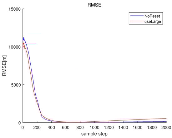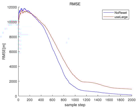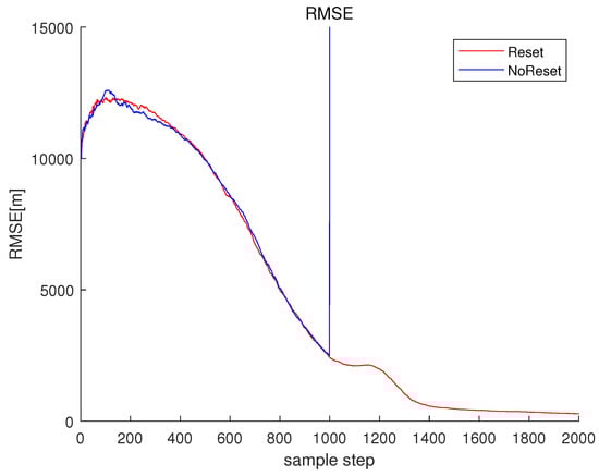 RMSE of Scenario 2. depicts (33) under the proposed filter reset strategy in Section 3.2. depicts in the case where the filter reset strategy is not applied.