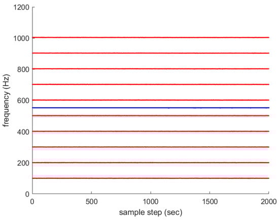 Recall that the sorted emitting frequency set is defined in (2). Every element in is sorted using (1). In practice, there may be a case where . This implies that a frequency line can appear or disappear at sample-step k. A frequency line change at sample-step k leads to a sudden jump in the average emitting frequency .
