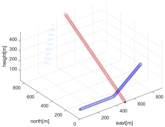 Figure 6 depicts Scenario 2. In this scenario, the trajectory of the ownship is identical to that in Scenario 1. A constant-velocity target starts from (500,0,0), and it moves with speed m/s. In (4), the target’s velocity vector is set as