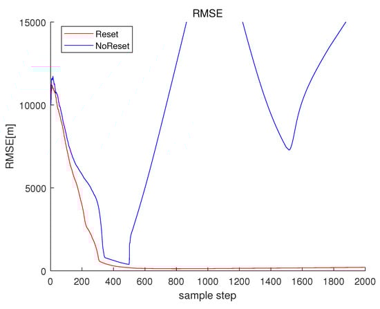 RMSE of Scenario 1. depicts (33) under the proposed filter reset strategy in Section 3.2. Under the proposed , converges to almost zero as time goes on. depicts (33) in the case where the filter reset strategy in Section 3.2 is not applied.
