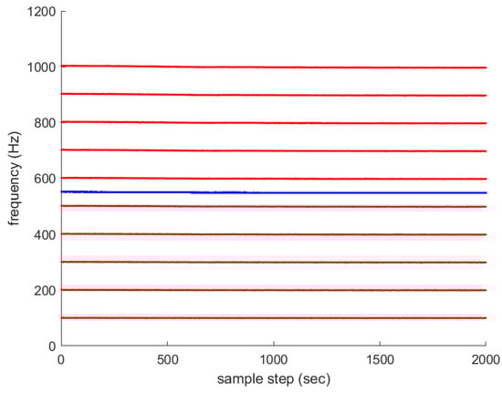 Associated with the scenario in Figure 4, in Figure 5 depicts as we track every frequency line one by one. Considering , is 64 s. We track every frequency line one by one, and the computational load increases compared to the case where we use the average frequency line as our filter state. Moreover, the RMSE increases compared to the case where we use the average frequency line as our filter state. Note that using the average frequency as our filter state, we can decrease the matrix size of the covariance matrix in the Kalman filter. This decreases the numerical error in the matrix calculations, such as the calculation of an inverse matrix.