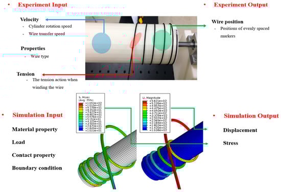 In order to ensure the accuracy and reliability of the finite element analysis results for flexible cables, it is essential to validate them through experiments. To achieve this, it is crucial to establish a correlation between the results of the finite element analysis and those of the experiments. In other words, it is necessary to select an appropriate analysis model that can effectively capture the behavior of the cable under different conditions and accurately predict its response. For flexible cable operations, as shown in Figure 1, the output value is determined based on the input variables of the finite element analysis, and the input and output variables in the experiment are also checked. These variables can include factors such as the material properties of the cable, the winding angle, and the applied tension. Once the input and output variables have been identified, the parameters of the analysis model are configured by combining the input and output variables that can be commonly utilized in both the finite element analysis and experiments. By selecting appropriate input and output variables and establishing an effective correlation between the finite element analysis and experimental results, it is possible to validate the accuracy of the analysis model and further improve its reliability.