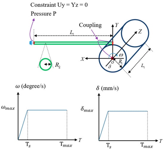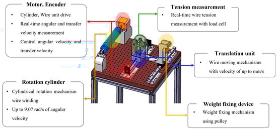 To validate the simulation results experimentally, an experimental setup was designed as shown in Figure 5. A linear motion device was used to transport the flexible cable in the axial direction of the cylinder while the cylinder rotated at a constant speed. This method allowed the cable to be wound around the cylinder, creating the same experimental environment as the simulation. Using this approach, simulation and experimental results could be more accurately compared in this study.