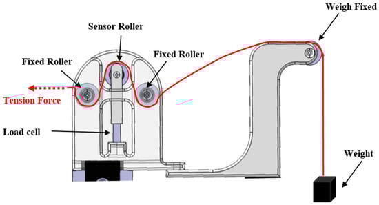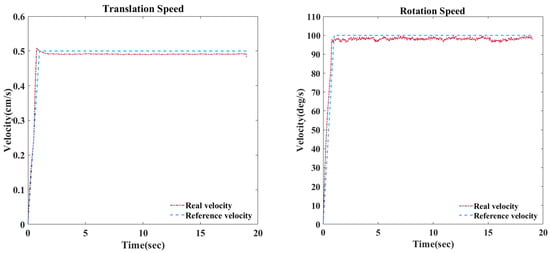 A mechanism for rotating the cylinder and a mechanism for moving the position of the wire were produced and constructed, and each mechanism was equipped with an encoder and a motor to enable real-time control. The system that controlled the rotation and transfer speed was configured to maintain a constant speed by transmitting the measured value from the speed measurement MCU to the motor control MCU. The MCU for speed measurement operated at 1000 Hz, and the MCU for motor control operated at 500 Hz, so it was possible to operate quickly and accurately. Figure 6 shows that, to maintain a constant tension while winding the flexible cable around the cylinder, a weight was attached to the end of the cable, and a load cell was attached to the cable transfer device to measure the initial tension and tension during the experiment [15,16]. In addition, the design allowed the cable to move smoothly using pulleys to minimize friction while the cable was wound around the cylinder. In the experiment, the rotational speed of the cylinder and the conveying speed of the wire were controlled through the PID algorithm [17,18] to ensure they were identical to the conditions of the finite element analysis. As shown in Figure 7, it was confirmed that the target value was closely followed. Reliability was improved by matching the conditions of the analysis and experiment.