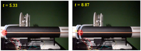 After fixing one end of the flexible cable to the cylinder, it was transferred in the axial direction of the cylinder and the displacement of the cable was measured using a high-speed camera while rotating the cylinder, as shown in Figure 8. During the cable winding, the coordinates ( of the marker center point were detected using the cylinder axis transfer distance and the diameter of the cylinder and cable. The high-speed camera used in the experiment can measure 1000 FPS at a resolution of up to 1920 × 1080 (FHD) and 24,046 FPS at a resolution of 640 × 96. The marker center coordinates were calculated by calculating the rotation speed of the cylinder and the number of frames of the high-speed camera. At this time, the distance from the center of the actual camera to the object changes due to the distortion of the camera lens, so the exact distance was corrected [19,20]. To accurately detect the position of the yellow marker attached to the cable, we used a specific color algorithm in OpenCV to detect its color [21,22,23]. We converted the marker’s RGB value to an HSV value to configure the algorithm for color classification. To prevent any potential issues with detecting objects with colors similar to the marker in the experimental environment, we extracted the RGB values of the markers in the image to detect accurate marker color information and adjust the threshold accordingly.