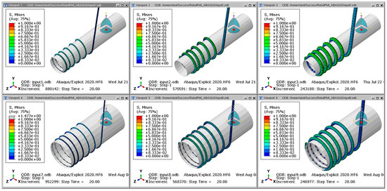 In order to simulate the winding of the flexible cable around the cylinder, a finite element analysis of the flexible cable was performed using ABAQUS, as shown in Figure 3. Since the change in the shape of the cable according to the material properties of the flexible cable is important, the flexible cable was analyzed by dividing the elements into an 8-node Reduced Integration Element (C3D8R) and setting the cylinder as an Analytic Rigid Surface. To improve the speed of finite element analysis, the element sizes were adjusted based on the cable diameter. In the radial direction, 12 nodes were positioned along the outer circumference of each cable cross-section. In the axial direction, the node spacing was set to approximately five times the cable diameter. For cables with a diameter of 2 mm, a node spacing of 10 mm was used in the axial direction. When the cable diameter increased to 4 mm, the axial node spacing was adjusted to 20 mm. In the case of a cable diameter of 6 mm, an initial axial node spacing of 30 mm was employed, following the same ratio as the previous cases. However, this configuration resulted in unacceptably slow analysis speed. As a result, the axial node spacing was modified to 50 mm to achieve a reasonable compromise between analysis speed and accuracy. By tailoring the element sizes according to the cable diameter, the finite element analysis could be performed more efficiently without compromising the essential features and behavior of the cables. The contact condition between the cylinder and the cable was general contact, and the dynamic/explicit analysis method was applied with the friction coefficient set to 0.1. The explicit finite element analysis method is an inertial force-based analysis method. It is suitable for problems with strong nonlinearity because it obtains a solution by substituting the value of the previous step into the next step without solving the stiffness matrix. In order to obtain a stable solution, the time interval is shortened to derive output variables such as acceleration, velocity, and reaction force over time, so it has the advantage of high convergence. The cylinder was set to rotate at a speed of , while the feed speed was . The speed increased linearly until 1 s, and the analysis was conducted at the same speed for 20 s after 1 s. represents the time it takes to reach the maximum speed, while represents the time it takes for the cable rotation and translation to be completed.