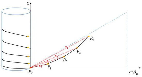 Accurately calculating the length of the cable curve involved measuring the difference in angle and z-coordinate change, while also taking into consideration the diameters of both the cylinder and the cable. It is worth noting that torsion occurs when the flexible cable is wound around the cylinder, which can have an impact on the curve distance calculation. To overcome this challenge, a cylindrical coordinate system was utilized, where the radius was determined by adding the cylinder radius to the cable diameter. The calculated curve length was then compared with the length before the cable deformation, and this comparison was carried out through both finite element analysis and experimentation. The detailed methodology for measuring the curve length is illustrated in Figure 10, while the comparison of results is presented in Table 5 and Table 6.