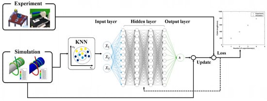 The K-NN algorithm was used to analyze the cable curve length error data obtained from the experiments and finite element analysis, resulting in accurate classification of the experimental conditions based on the given cable length. The achieved classification accuracy was up to 91.3%. Using accumulated data classification and error automatic update with DNN, weights were obtained for new input data not included in the classified data. The input data included the cylinder diameter, cable diameter, tension, and others. The neural network was constructed with three hidden layers, each consisting of ten nodes, and ReLU (Rectified Linear Unit) was used as an activation function for the output weights. The weight derived in this way was multiplied by the finite element analysis result to update the cable length in the simulation [26,27,28]. The error calculations obtained by comparing the updated finite element analysis results with the experimental results are shown in Figure 11. In Formula (4), represents a weight derived through machine learning using the cylinder diameter, cable diameter and tension as input variables for updating the distance between cable markers. represents a node’s weight for each input variable. In Equation (5), is the distance between markers in the finite element analysis, and represents the distance between markers calculated through experiments.