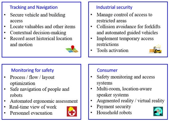 IPSs have enabled various navigation applications that highly require the instant location of a person and any objects in real time, uniformly localizing the mobile device or objects in an indoor environment [39,40]. It has opened up various new possibilities in industrial, consumer IoT markets and healthcare. In industrial environments, there is a growing interest in IPSs for logistics and manufacturing to ensure the precise navigation of automatic robots, tracking personal tools and equipment in large warehouses and factories. In such environments, device movement can be potentially dangerous, so automatic device tracking has become a fundamental aspect of Industry 4.0 for safety [41,42]. Additionally, there is an increasing legal requirement for the continuous tracking of coal miners in underground mines due to the increasing number of disasters with many fatalities. These positioning systems can help to connect front-end workers and improve safety [43]. In the consumer IoT market, real-time and reliable location information can digitalize and optimize virtually every aspect of asset and data management for efficiency and security in manufacturing operations and working spaces [44]. Context-aware location-based marketing is undergoing a great change and shows potential improvements in both sales and profits side in e-commerce [45]. This type of marketing strategy enhances the shopping experience in real time by considering the buyer’s social profile, shopping history, feedback requirements, spending pattern, history of navigation, online behavior, and so on. Finally, IPSs are attracting attention in healthcare due to the need to improve service quality, such as monitoring biomedical equipment location or guiding patients in crowded hospitals [46]. For example, in the case of emergency patients, doctors can track the safety and mobility of patients instantly. Other applications, such as map construction and route planning, are well suited for IPSs [47]. The map construction is a fingerprinting-based localization approach that consists of an offline stage and an online stage. Fingerprints are in the form of radio frequency (RF) signal strength, which is collected and stored in the offline stage. The location pair consists of exhaustive records of the serviced area. For the online stage, location estimation is estimated by comparing the collected testing records to the stored training fingerprints. Furthermore, route planning for intelligent localization and navigation systems is another extremely useful technology with both military and commercial applications. For standard route planning algorithms, it generates a minimum cost route based on a predetermined cost function. The beneficial opportunities for IPSs are summarized in Figure 1.