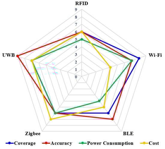 Figure 2. Wireless technologies for IPS comparison in terms of coverage, precision, energy efficiency and cost.