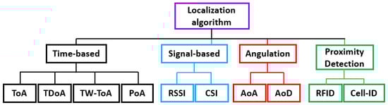 IPS ranging algorithms can be basically classified into four categories based on their underlying principle—time, signal, angulation, and proximity detection—as illustrated in Figure 6. Time-based algorithms include time of arrival (ToA), time difference of arrival (TDoA), two-way (TW)-ToA and phase of arrival (PoA). Signal-based algorithms rely on RSSI and channel state information (CSI). Angulation-based algorithms use angle of arrival (AoA) and angle of departure (AoD) to determine position. Proximity detection-based techniques use RSSI and Cell-ID. ToA, TW-ToA, TDoA, AoA, and RSSI are commonly used with UWB in the literature. In the upcoming sections, we will discuss these methods in detail.