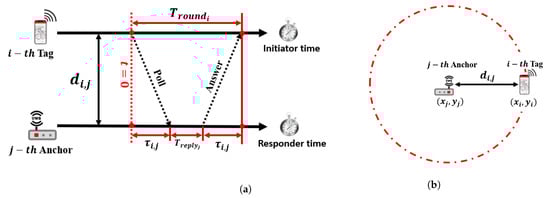 Figure 7. ToA positioning algorithm. (a) Signal propagation time calculations. (b) Estimated range scheme.The estimate range between the i-th anchor and j-th tag can be determined aswhere m/s representing the speed of light.The above equations reveal that the ToA algorithm is susceptible to errors resulting from time measurements. A s time measurement error can result in an error of 300 m using RF wave velocity. Therefore, the ToA algorithm requires precisely synchronized clocks for both anchors and tags, which can be challenging in terms of hardware design and cost effectiveness. After determining the estimated range between each anchor and tag, trilateration theory can be employed to calculate the position of the mobile tag using the ranges obtained from more than three anchors at fixed known locations as shown in Figure 7b. To estimate the position of the i-th tag with respect to the j-th anchor, let us set the coordinates of the j-th anchor as and being fixed in known positioning. Set the coordinates of the i-th tag as , where denotes the estimated position. The position of the tag is estimated by intersecting circles (in 2D) or spheres (in 3D) with radii and , respectively. The optimal position of the tag can be obtained by applying the least-squares solution and the minimum mean square error estimation algorithm - Two-Way Time of Arrival (TW-ToA): The ToA method described above can offer high positioning accuracy but requires precise synchronization of the anchors and tags, which can be challenging to implement. Alternatively, the TW-ToA method shown in Figure 8 can be used to measure the signal propagation time and eliminate the synchronization requirement. The total propagation time for between the j-th anchor and i-th tag can be calculated using the TW-ToA method and is expressed aswhere and are the two-way return time and and are the responding time of the anchor and the tag, respectively, as shown in Figure 8.