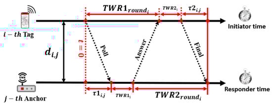 Figure 8. TW-ToA positioning algorithm. - Time Difference of Arrival (TDoA): TDoA is another time-based measurement algorithm related to ToA and TWR-ToA. The principle of this algorithm is to measure the difference in arrival time between two signals as shown in Figure 9. While the anchor still requires precisely synchronized clocks, the tags do not need to be as precisely synchronized compared to the ToA method. This leads to high-power efficiency, as only one transmission message is required from the tag to the anchor. The location of the mobile tag can be obtained from the intersection of multiple hyperbolas. Consider that the anchors are located at and the coordinates of the tag are . The distance between the target and the reference base station can be expressed as a difference in arrival time, given as