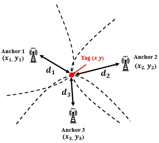 Figure 9. TDoA positioning algorithm. - Angle of Arrival (AoA): The AoA algorithm, as shown in Figure 10, estimates the position of a mobile object based on angle measurements obtained by antenna arrays at the receiver side. The phase difference between two anchors is used to calculate each angle measurement, and the location of the mobile object can be determined from the intersection of the angle lines. In a two-dimensional Cartesian coordinate system, two anchors are located at , and the coordinates of the mobile object are . The angles related to anchor-i from the standpoint of the mobile object are The angles measured by the anchors are denoted as The location of the tag can be formulated aswhere and have the following relation: