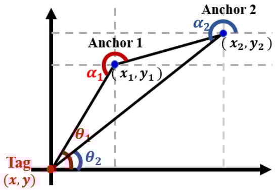 Figure 10. AoA positioning algorithm.The target’s location can be figured out by solving the equation. - Received Signal Strength Identification (RSSI): To further expand on the RSSI algorithm, location fingerprinting involves collecting a database of RSSI values at known locations in the environment, known as “fingerprints”. When a mobile tag enters the environment, its RSSI values are compared to the fingerprints in the database to determine its location. This approach can improve the accuracy of the RSSI-based positioning system, but it requires significant effort to build and maintain the fingerprint database. Additionally, changes in the environment, such as moving objects or changes in building materials, can impact the accuracy of the system. Overall, RSSI-based algorithms can provide a low-cost solution for indoor localization, but their accuracy can be impacted by various environmental factors. In addition, these algorithms may not be suitable for applications that require high precision, such as industrial automation or autonomous vehicle navigation. The theoretical relationship between received signal strength and distance is as follows:where is the reference distance, and are transmitted power and pass loss at the reference point, and is a Gaussian random variable with zero mean that represents shadow fading and the path loss exponent.