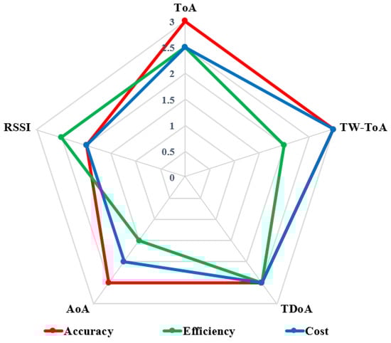 Figure 11. Comparison of the different positioning algorithms in terms of accuracy, cost and efficiency.Finally, to conclude this section, the current advances for UWB positioning algorithms in the literature are summarized in Table 4. The table categorizes each paper concerning the publication year, positioning algorithm applied, and the basic description explaining the rationale and methodology for each paper.