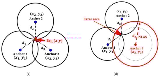 Detection of UWB positioning system. (a) Signal propagation in LoS scenario. (b) Signal propagation in NLoS scenario. (c) Positioning algorithm in LoS scenario. (d) Positioning algorithm in NLoS scenario.
