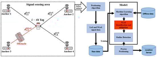 To improve the accuracy of UWB positioning systems, specific NLoS mitigation techniques are required for various applications. Figure 13 illustrates a block diagram of a complete UWB precise IPS, which starts by fixing the anchors for the coordinate system and locates the mobile UWB tags within the indoor environment. The collected raw data will be used by an additional processing step for NLoS detection, which is performed using an ML classification algorithm that has been pre-trained with the raw measurement data. This model is used to mitigate the NLoS effects. For NLoS classification, the ML is used to classify the LoS and NLoS by different signal features or CIR values. For NLoS error correction, the ML can be applied for predicting the error accurately. The actual range between the i-th anchor and the j-th tag is defined as: