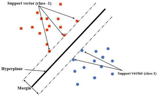 Figure 14. SVM algorithm.The advantages of SVM are as follows: firstly, strict mathematical theory support and strong interpretability due to the algorithm not requiring typical statistical methods, thus simplifying the usual classification and regression problems; secondly, it is easy to find key samples (i.e., support vectors) that are critical to the algorithm which can handle nonlinear classification and regression tasks; and thirdly, the calculation complexity of the algorithm depends on the number of support vectors instead of the dimensionality of the sample space, which can simplify the calculation process. In contrast, the disadvantage is that the training time is long due to the prediction running time being proportional to the number of support vectors. - Decision Tree (DT): The DT algorithm is very suitable for large datasets with complex different features due to its ability to mimic human-like thinking for interpreting the data [98,99]. The advantage of DT is that it can break down the dataset into smaller subsets to operate the classification, which can minimize the classification error. In addition, DT can decide which attribute is the best at each tree node to ensure the high accuracy of the classification. The main advantage of decision tree learning is that it can minimize the error at the tree root due to it creating a single outcome by creating the tree at every leaf. Meanwhile, each tree root will also take a longer running time, which is the main disadvantage; therefore, it is not suitable for the application, which requires a fast response.