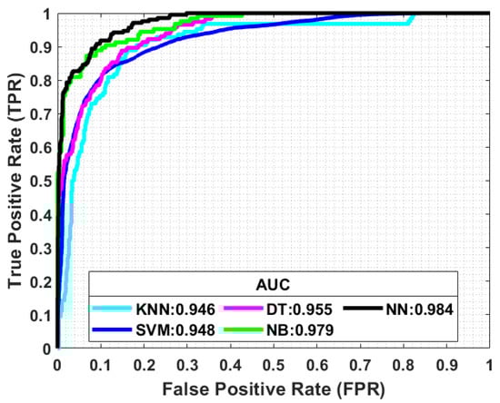 Receiver operating characteristics (ROC) and area under the curve (AUC) comparison of the state-of-the-art ML algorithms.