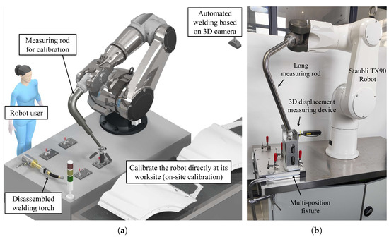 Robot calibration involves measuring a robot’s end effector at different joint angles using high-precision measuring equipment to determine accurate kinematic parameters. Currently, calibration is typically performed after a robot’s manufacturing, known as in-house calibration. The advantages of in-house calibration include: First, the calibrated parameters can be embedded directly into the robot controller [1]. Second, purchasing expensive measuring equipment, such as laser trackers [2], optical CMM [3], and even CMM [4], is cost-effective due to their high use frequency. However, the accuracy of robots degrades as they are continuously used, so it is necessary to monitor the robots’ accuracy online and conduct on-site recalibration (Figure 1a) when the accuracy is severely degraded [5]. On-site calibration is especially important for robots with off-line programming and visual navigation, as the absolute accuracy of a robot, rather than its higher repeatability, ensures that the motion instructions can be directly used for real tasks. Although some manufacturers provide on-site calibration services, most still have to rent expensive laser trackers from a local provider of metrology services [1]. This has spurred many researchers to develop various portable and affordable measuring devices for on-site robot calibration.