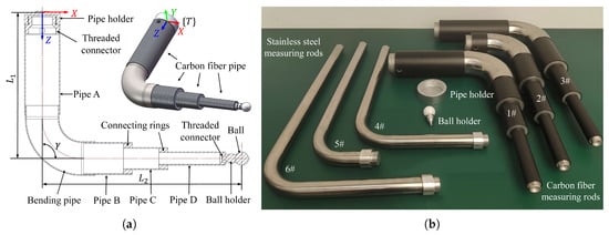 The measuring rod is improved by using a new structure and carbon fibre pipes, as depicted in Figure 3a. Two high-strength aluminium rings connect different carbon fibre pipes, and a stainless-steel bending pipe is used at the bend. All parts of the rod are bonded with high-strength epoxy resin adhesive. The pipe and ball holders are installed at the start and end of the measuring rod using threaded connectors, used for rapid installation and removal with the robot flange and precision ball. Three different configurations of the carbon fibre rods (Figure 3b, see Section S1 of the Supplementary Materials for the detailed design parameters) are developed to replace the previously-used stainless-steel measuring rods in [6].
