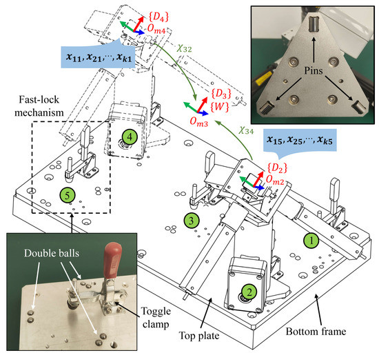 The MultiCal system also includes a fixture with multiple clamping positions fixed relative to the robot’s base, such as the multi-position fixture shown in Figure 4. This fixture is designed to be compact and lightweight, making it easy to transport and embed into the robot’s cells. Equipped with multiple fast-lock mechanisms, comprising a toggle clamp and three sets of point positioning components made of tungsten steel. These components, consisting of a single pin and two balls spaced at a certain distance, ensure assembly accuracy.