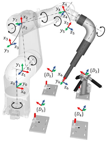 This section presents the robot kinematic model, the parameters that need to be identified, and the calibration algorithm. In this paper, we have chosen the Staubli TX90 robot (Figure 5) as a representative for validating the effectiveness of our method. This model features a classic 6-DoF configuration and can effectively represent a significant portion of medium-sized robots. For robots of different sizes and configurations, the measuring rod’s geometric dimensions can be reselected and optimized following the approach outlined in this paper and [6].