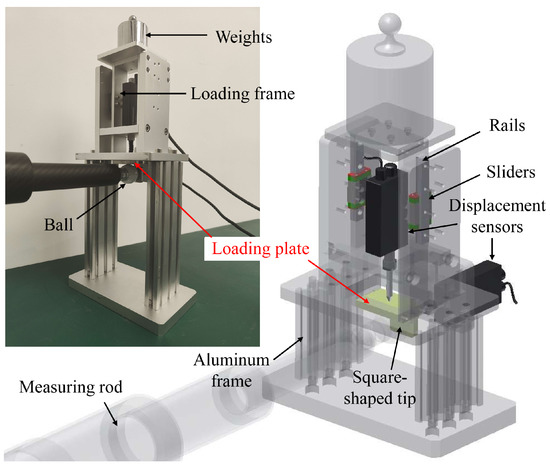To estimate the rod deformation error using the model derived above, we need to determine the compliance coefficients of the measuring rod in the directions. To achieve this, we conducted both an FEA (Figure 6a) and a real measurement experiment to obtain these parameters. Firstly, we imported the 3D model of the measuring rod, built in SolidWorks, into ANSYS to perform a static deformation analysis. This allowed us to obtained the maximum directional deformation values of the spherical tip in the directions, approximating the TCP offset values. These values were used to calculate the corresponding compliance coefficients. Secondly, a two-dimensional stiffness-measuring device was developed to determine the stiffness through measurements (Figure 7, see Section S4 of the Supplementary Materials for detailed design and measurement results). By putting different weights on the loading frame, we can apply different loads to the measuring rod and measure its vertical and horizontal TCP offset under the load. The TCP offset measurement method satisfies the Abbe measuring principle [23] and eliminates errors caused by rotation of the loading plate.