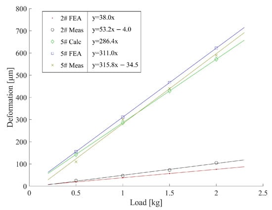 Rod stiffness was determined by both FEA and actual measurement using the device depicted in Figure 7. Gravitational loads of 0.5, 1, 1.5, and 2 kg were applied and the resulting TCP offset measurement was repeated five times for each load. The average TCP offset is plotted in Figure 8. We compare the Y-directional compliance coefficients of the 2# (carbon fibre) and 5# (stainless-steel) measuring rods as an example. Furthermore, the theoretical TCP offset (denoted as “5# Calc”) of the 5# measuring rod was calculated based on Equation (15), because the structures of the stainless-steel measuring rods are similar to that of the theoretical model.
